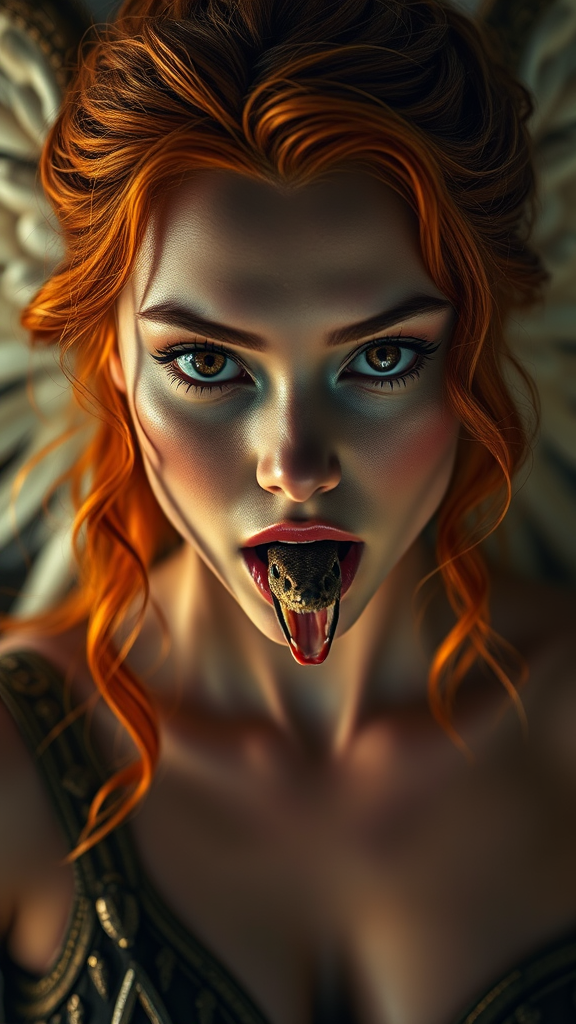 A warrior goddess with an angelic face and fiery hair opens her mouth, revealing a serpent emerging from within. Her large eyes and flawless skin are highlighted in this full-body portrait. It's a magical photograph with dramatic lighting, capturing a photorealistic and intimate cinematic composition, featuring subtle contrasts.