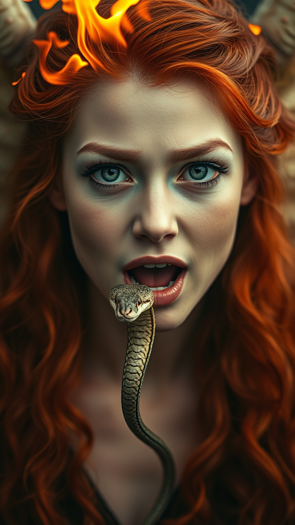 A warrior goddess with the face of an angel, her fiery red hair cascading in flames. Her mouth is open, revealing a snake emerging from within. She has large, expressive eyes and a complexion that is clear and soft, captured in a full-body portrait. The photograph exudes a magical quality, with dramatic lighting enhancing the cinematic and intimate composition, showcasing a realistic and harmonious blend of elements with subtle contrast.