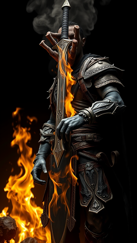 A warrior reminiscent of a Dark Souls character holding a greatsword pointed downward, set against a detailed and dramatic black background. The scene is dichromatic, emphasizing the intense and dynamic fire effects reminiscent of a Flame Temple, with flames casting an eerie glow in 16k UHD HDR resolution. The character exhibits surreal and surrealistic traits, suggesting mutation with disfigured features, such as elongated neck, extra fingers, and uniquely contorted hands. The image maintains a high level of detail with a focus on the absurd and otherworldly, avoiding any out-of-frame elements, blurriness, or digital artifacts like watermarks, logos, or text overlays. There is an emphasis on bold, expressive visuals that blend dark fantasy with a touch of artistic abstraction.