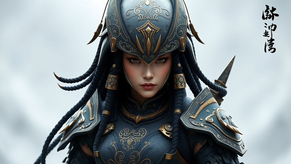 A warrior woman dressed in an ultra-detailed predator cosplay, blending elements of Unreal Engine 5 technology with the elegance of Ming Dynasty artistry. Her costume features intricate dark gray and gold patterns, showcasing blink-and-you-miss-it details and an anime aesthetic. The design is both stylish and avant-garde, with a dynamic structure and elegant flourishes that capture the essence of both historical and futuristic influences. She stands poised, exuding an aura of strength and grace, embodying the fusion of tradition and innovation.