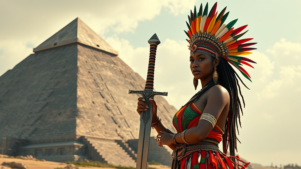 A warrior woman in a vibrant, indigenous-inspired outfit stands proudly before an ancient pyramid, her hand gripping an intricately designed sword. Her elaborate headdress boasts colorful feathers and metal embellishments, reflecting the ethos of her ancestors. The scene is a striking 3D render inspired by Chinwe Chukwuogo-Roy's art style, intertwined with Afrofuturism elements, showcasing a harmonious blend of tradition and future.