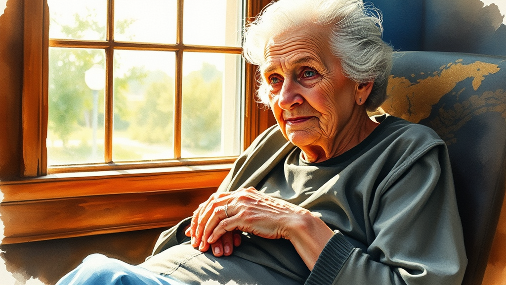 A watercolor painting captures a wise elder seated near a window, where the afternoon sun casts a gentle glow on her weathered hands resting gracefully in her lap. Her eyes carry a subtle smile, hinting at fond memories of life's simple beauties. The impressionistic brushwork, reminiscent of Alice Neel or Dianne Sherman, evokes a narrative of a life lived with elegance and wisdom.