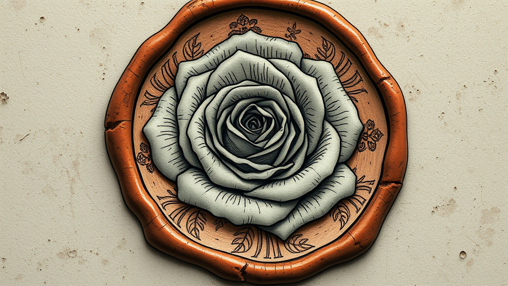 A wax seal featuring a detailed rose design, intricately rendered with delicate linework, inspired by the styles of Brian Mashburn, Jean-André Rixens, and Marjane Satrapi. The composition is emotionally evocative, viewed from above, capturing the essence of an aerial perspective. The artwork features a nuanced blend of melancholy and elegance, with a hint of classic sophistication reminiscent of a 1970s aesthetic. The colors are rich and subdued, enhancing the emotional depth and artistic complexity of the piece.