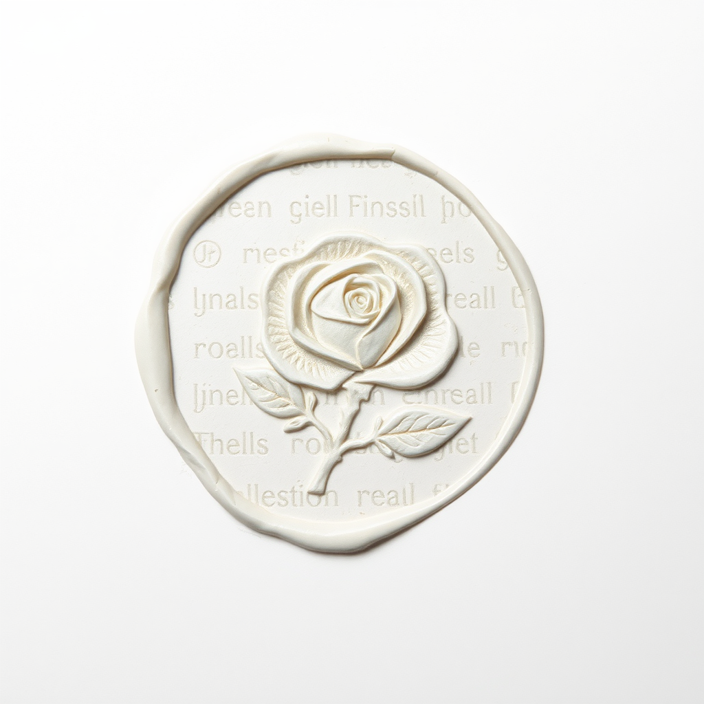 A wax seal featuring a detailed rose design, set against a pristine white background, captures the intricate, atmospheric style reminiscent of Brian Mashburn and the emotive depth of Jean-André Rixens. The composition, viewed from above, showcases the emotional complexity found in Marjane Satrapi's work, with subtle nods to classic elegance and refinement, evoking the timeless sophistication of the 1970s to the present. The piece maintains a sense of modern artistry, blending traditional motifs with a contemporary twist.