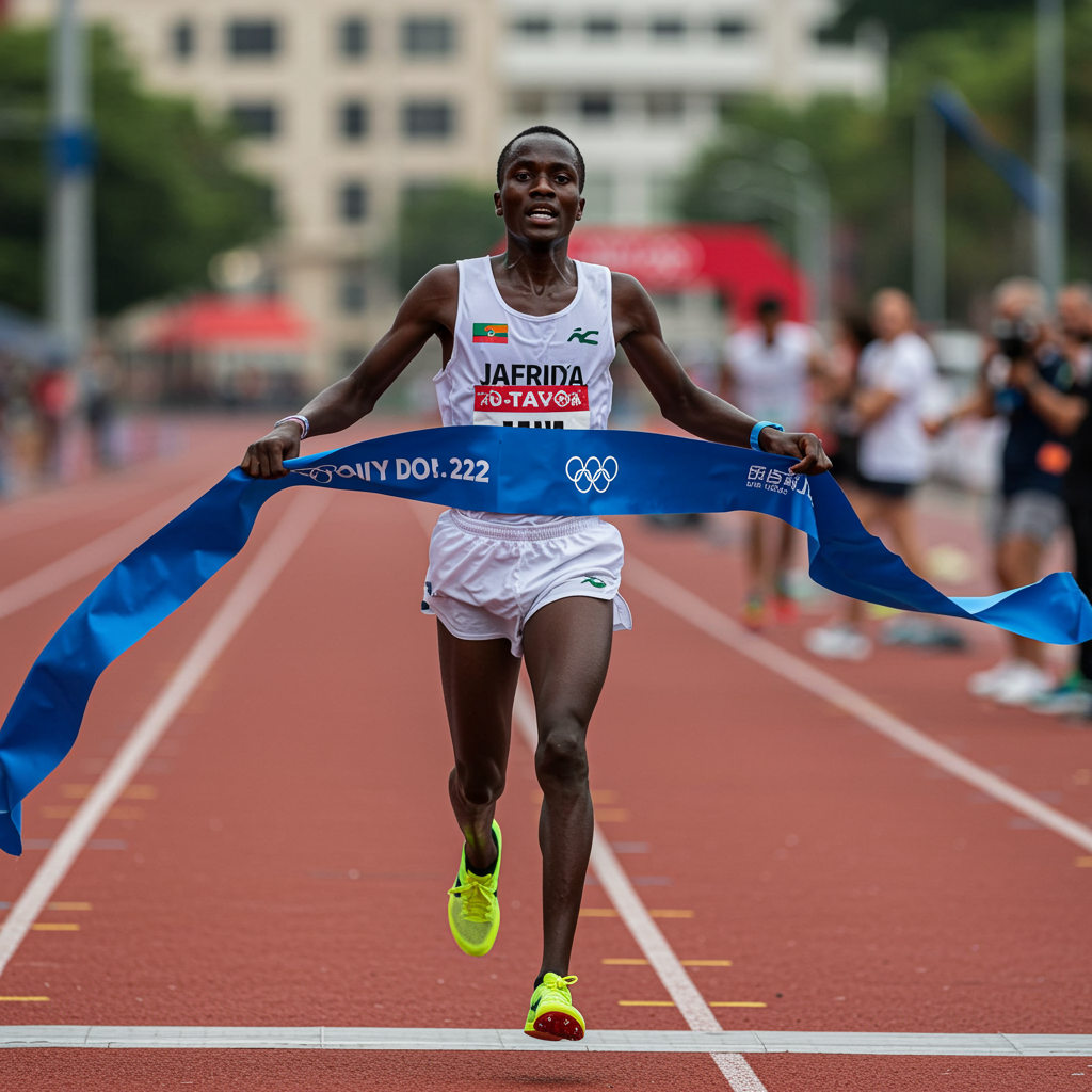 A weary black African runner, his spirit unwavering, crosses the finish line, the blue ribbon snapping against his chest as his powerful stride propels him forward, his white jersey soaked with determination and triumph.