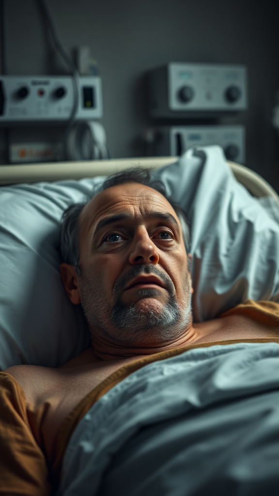 A weary man, appearing unwell, reclines on a hospital bed, his eyes meeting the viewer's gaze, surrounded by the sterile, clinical environment of a hospital room, with medical equipment softly humming in the background and a dim, comforting light casting gentle shadows.