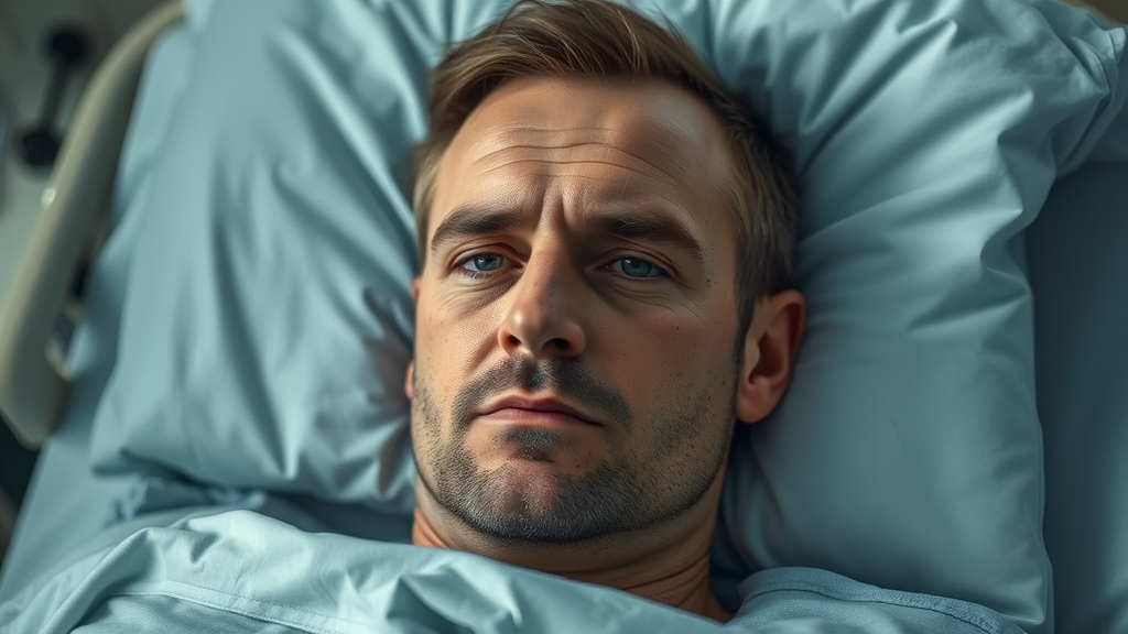 A weary man lies in a hospital bed, his pallor highlighting the exhaustion etched across his face. The sterile backdrop of medical equipment and muted lighting frames his form as he gazes toward the viewer with eyes revealing a mixture of vulnerability and quiet resilience.