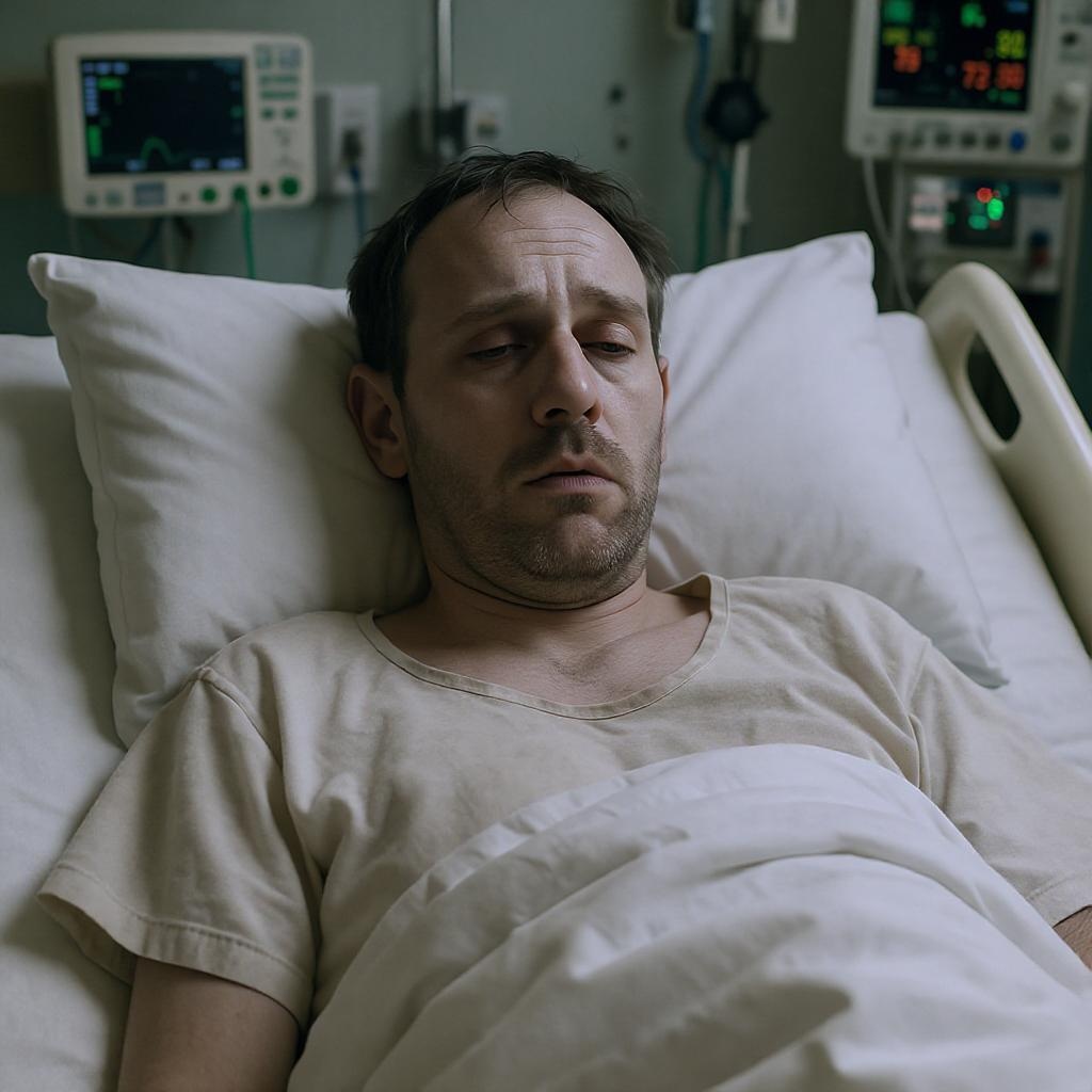 A weary man, pallid and fatigued, reclines on a hospital bed, his eyes meeting yours with a silent plea, surrounded by the sterile ambiance of medical equipment and soft, beeping monitors in a sterile hospital room.