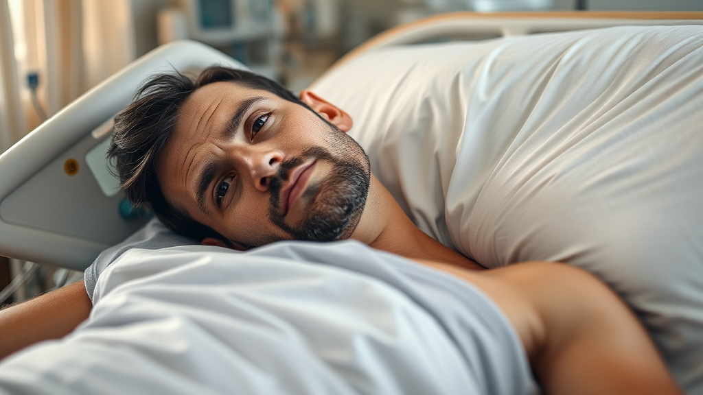A weary man reclines on a hospital bed, his eyes meeting the viewer's gaze with a mix of vulnerability and quiet strength, surrounded by the soft hum of medical equipment and the gentle backdrop of a sterile yet comforting hospital room.