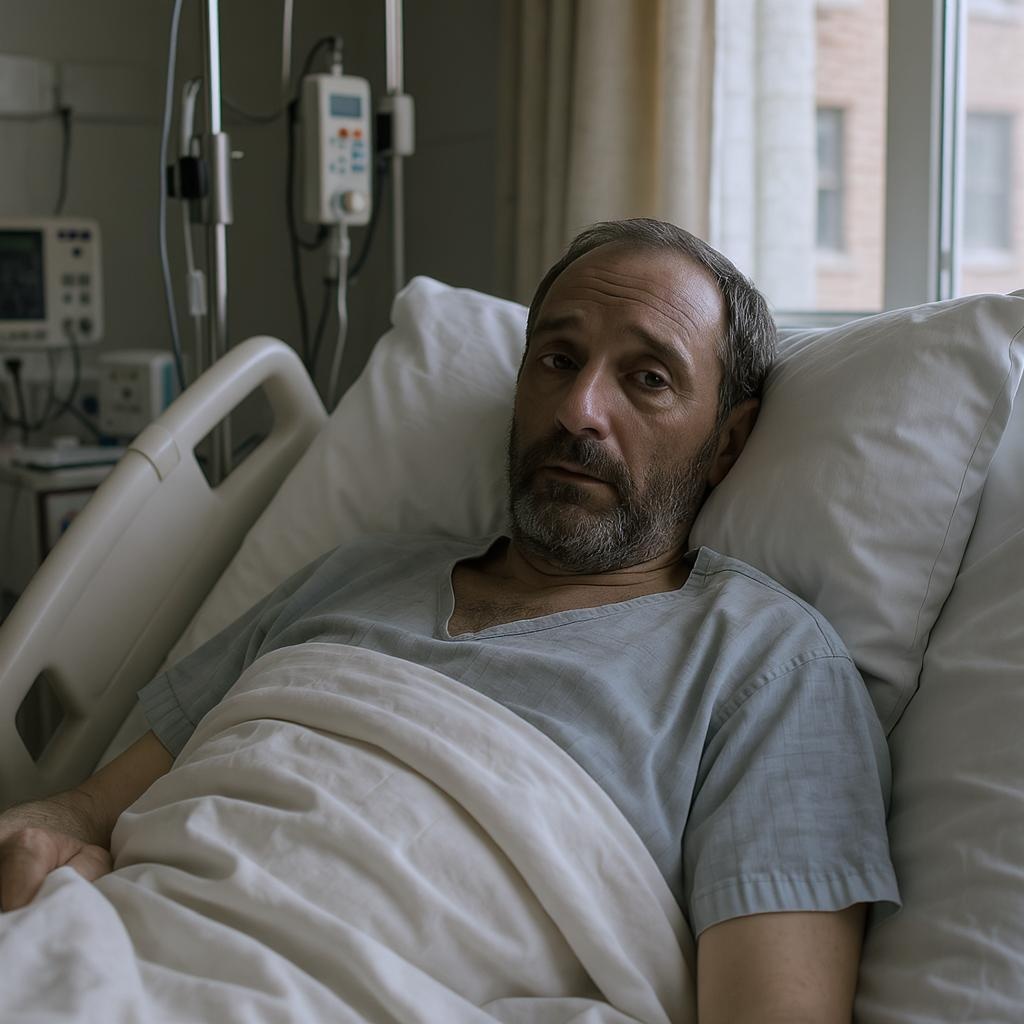 A weary man reclines on a hospital bed, his eyes meeting the gaze of the viewer, amidst the clinical setting of the hospital room, medical equipment quietly humming around him as soft sunlight filters through the window, casting gentle shadows over the sterile white sheets.