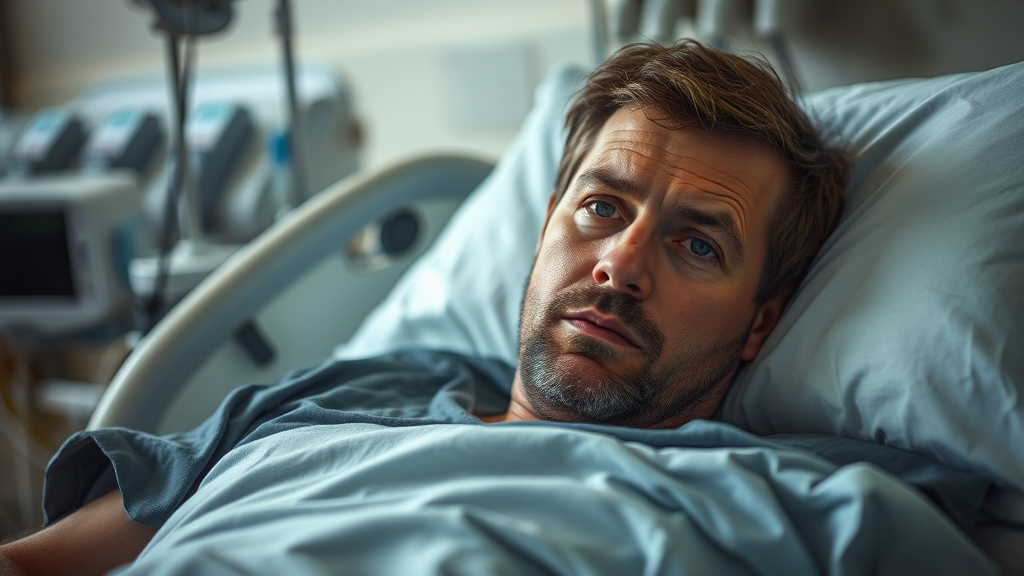 A weary man rests on a hospital bed, his eyes meeting the viewer's gaze with a hint of vulnerability, surrounded by the soft hum of medical equipment and the sterile, muted tones of the hospital room.