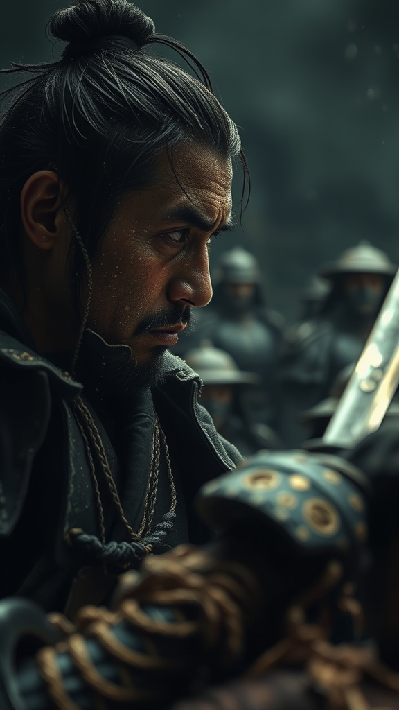 A weary samurai gazes at the fallen enemy, rising amid the aftermath of battle, terror and exhaustion etched into his visage, grains of sand clinging to sweat-drenched skin, enveloped in a dark, foreboding atmosphere. In post-production, the details are meticulously refined, enhancing the sharpness and contrast to create a hyper-realistic effect, with subtle creative adjustments infusing the scene with a haunting, almost ethereal quality, while staying true to the core essence of the original vision.