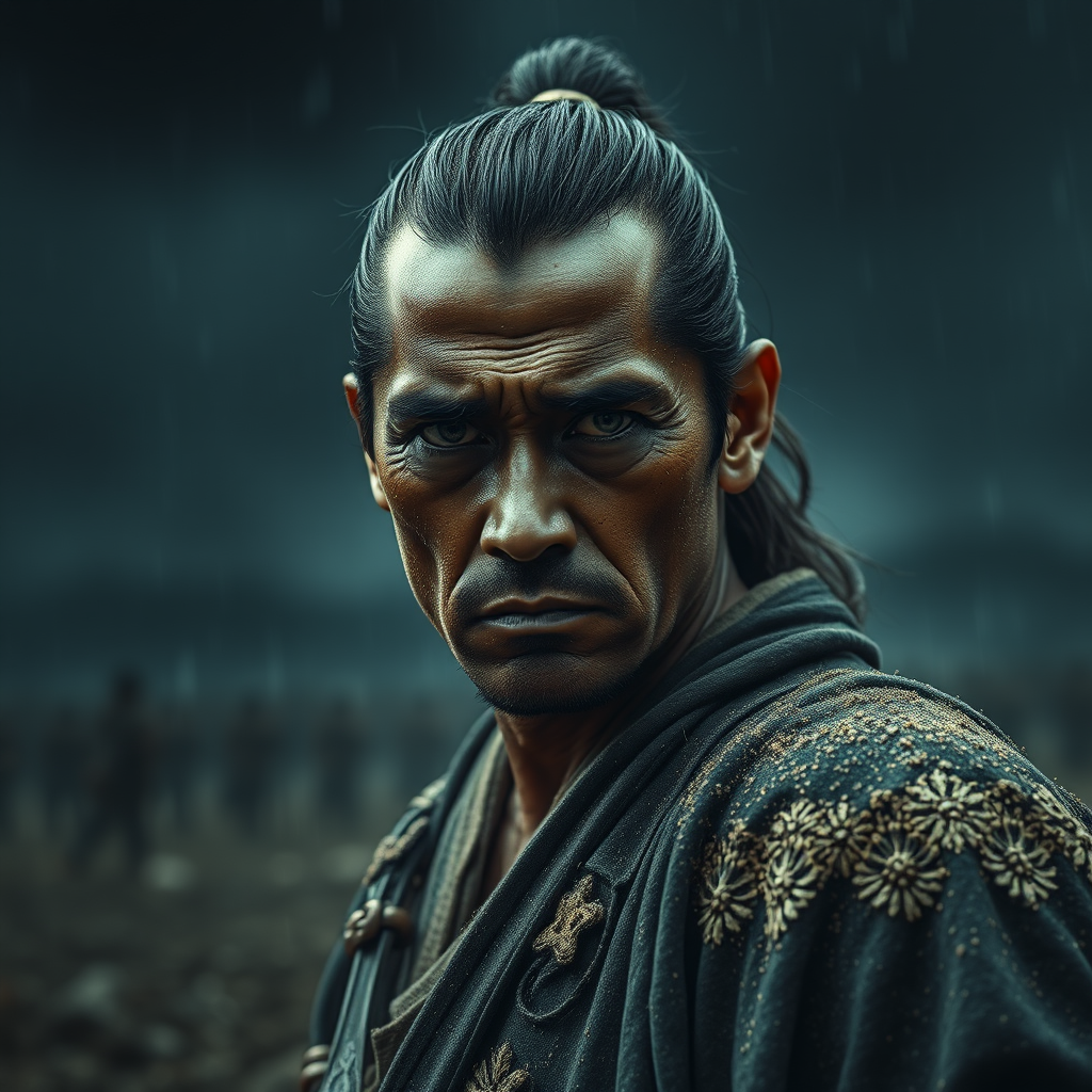 A weary samurai stands amid a desolate battlefield, eyes locked on the distant enemy, his expression a haunting mix of fear and exhaustion. His face is streaked with sand and sweat, revealing every grit-laden pore under the dim, foreboding sky. The atmosphere is thick with an oppressive darkness, casting shadows that dance eerily over the scene. In post-production, each detail is meticulously enhanced, augmenting the sharpness and contrast to create a hyper-realistic effect. Small creative touches transform the raindrops falling around him into glistening beads that catch and refract the scarce light, accentuating the overall sense of dread and weariness.