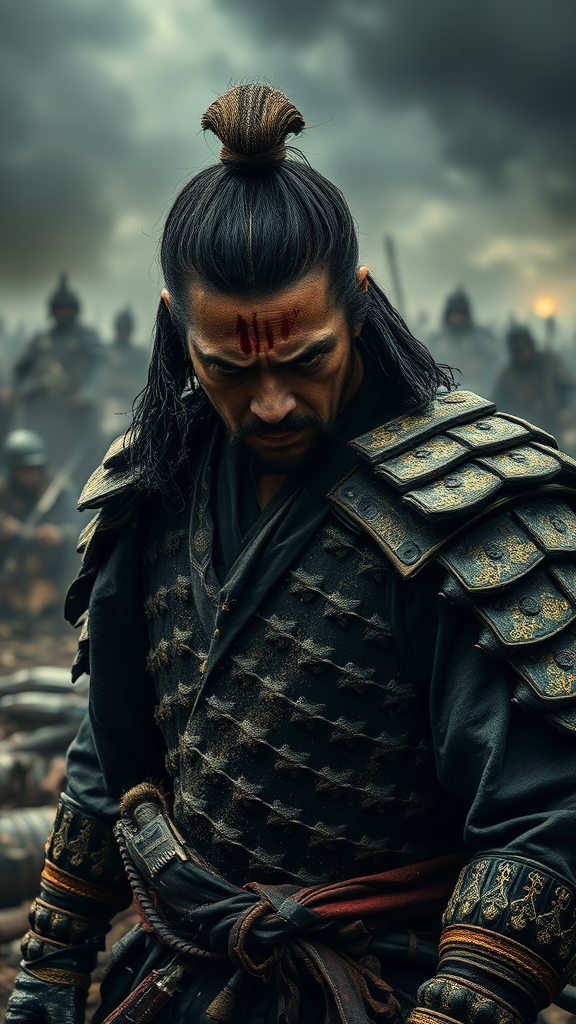 A weary samurai stands amidst the aftermath of battle, gazing intently at his defeated foes with a mixture of fear and horror etched across his face. His features are drawn and exhausted, sand and sweat mingling on his skin, telling tales of the fierce conflict just endured. An aura of darkness and menace envelops the scene, casting shadows that dance ominously around him. The hyper-realistic atmosphere captures every detail with heightened precision, from the glint of anguish in his eyes to the intricate patterns on his armor. The image is meticulously enhanced in post-production, amplifying sharpness and contrast to achieve an intense, lifelike quality. Small creative touches are added: the faint whisper of a storm brewing in the distance, and the subtle glimmer of morning light breaking through the clouds, hinting at a sliver of hope amidst the desolation.