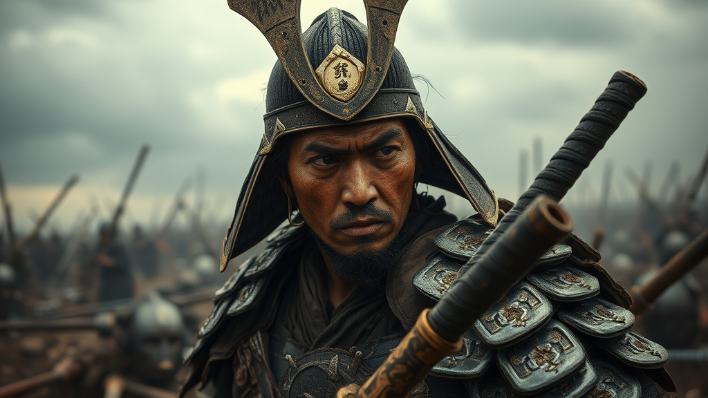 A weary samurai surveys the aftermath of the battlefield, his eyes locked onto the enemy remnants with a mix of fear and horror etched across his face. Exhausted and battered, he stands amidst the eerie stillness, his features caked with a gritty blend of sand and sweat, telling the tale of a fierce struggle. The atmosphere is thick with a suffocating darkness, evoking a sense of dread that lingers in the air. Under a foreboding sky, each intricately detailed element of his armor and weaponry catches the subdued light, emphasizing the hyper-realistic intensity of the moment. Subtle changes accentuate the raw emotion and stark contrast of this haunting scene, maintaining the core spirit of resilience and desolation.