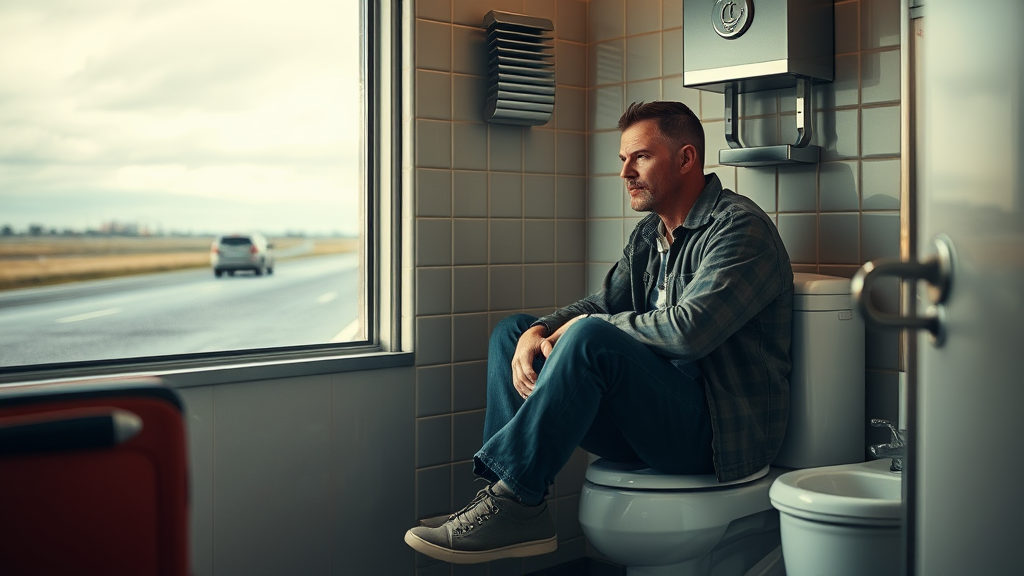 A weary traveler finds a rare moment of peace in the cramped confines of a roadside diner restroom, where he sits pensively on the toilet, contemplating the journey ahead as he listens to the distant hum of the highway.
