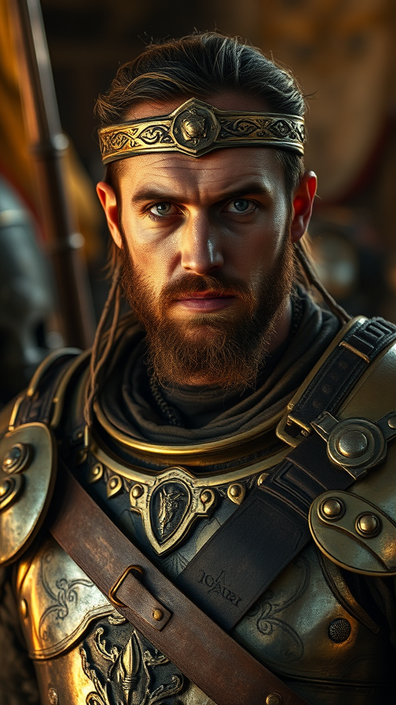 A weary warrior clad in shimmering golden armor, fatigue etched on his resolute face, stands under the soft glow of accent lighting. His eyes, full of stories after a relentless war, convey deep emotion. The scene, captured through a cinematic lens with the subtle blur of a 35mm frame and an f/1.8 aperture, highlights every detail. Global illumination casts a warm, encompassing light, enhancing his strong yet vulnerable presence amid the aftermath of battle.