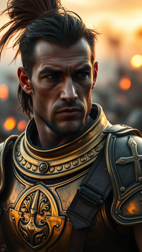 A weary warrior in gleaming golden armor stands under the fading light of dusk, his eyes reflecting the weight of countless battles endured. His chiseled features are accentuated by the soft glow of distant fires, captured with a cinematic touch that reveals every line of fatigue etched across his face. Shot with a 35mm lens at f/1.8, the image softly blurs the chaotic backdrop of a war-torn landscape, bringing the solemn intensity of his gaze into sharp focus. Subtle accent lighting dances across the fine engravings of his armor, while global illumination highlights the textures of his worn battle gear, telling silent tales of valor and resilience.