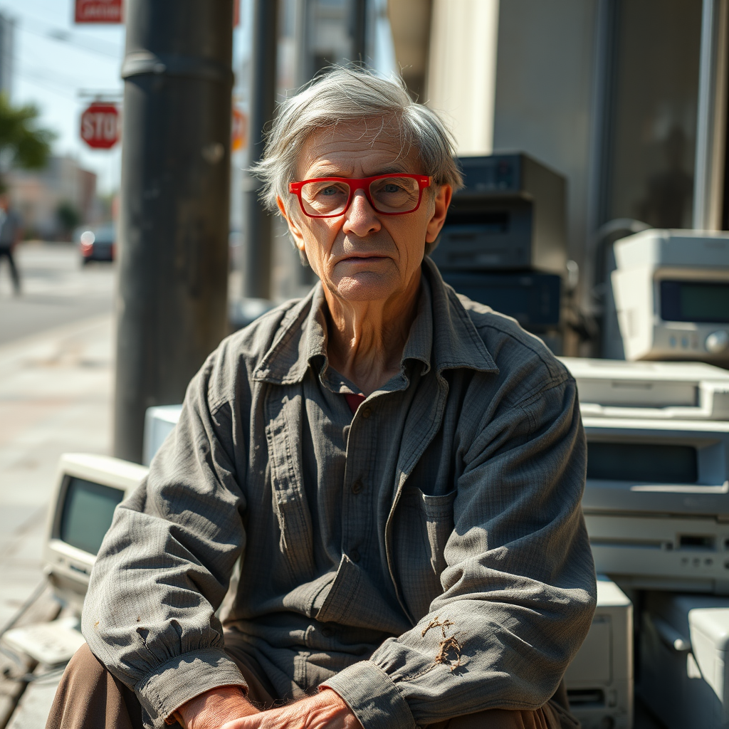 A weathered and unkempt man resembling Bill Gates sits on a sunlit street corner, donning tattered, grimy clothing with a distinct pair of red glasses held together by tape. Surrounding him is a haphazard collection of obsolete computers and printers, reminders of a bygone technological era. The Canon EOS Rebel SL2 captures this poignant scene with an EF 100mm f/2.8L Macro IS USM lens, emphasizing the contrast between the worn details of his attire and the stark, clear light of midday, as the camera's settings bring every detail into sharp relief.