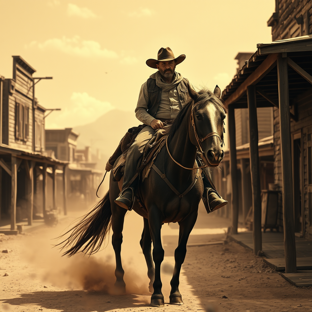 A weathered cowboy astride a powerful stallion navigates through a dusty street of a frontier town, rendered in the timeless sepia palette reminiscent of a Leonardo Da Vinci canvas, where shadows and light dance over worn wooden structures, capturing the spirit of adventure and solitude in the unfolding Western landscape.