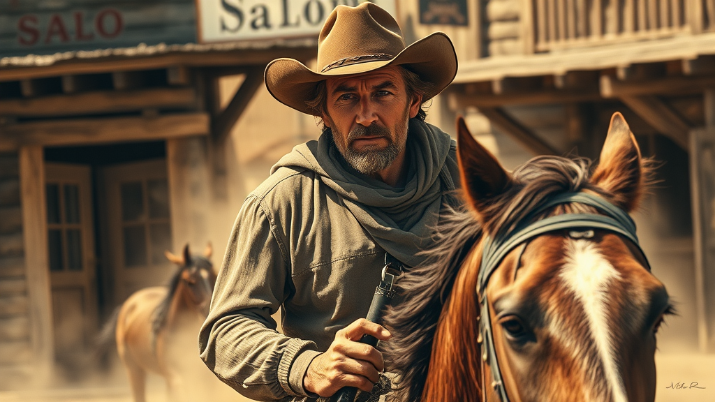 A weathered cowboy with a determined gaze rides a powerful stallion through a dusty western town, the scene captured in warm sepia hues. The cowboy's worn hat casts a shadow over his eyes, highlighting his rugged features. The horse's muscles are expertly rendered, showing lifelike movement and strength. The background is filled with rustic wooden buildings, a saloon's swinging doors creaking slightly in the breeze. This masterful composition, reminiscent of Leonardo Da Vinci's touch, blends precise anatomical detail and the timeless spirit of the Old West.