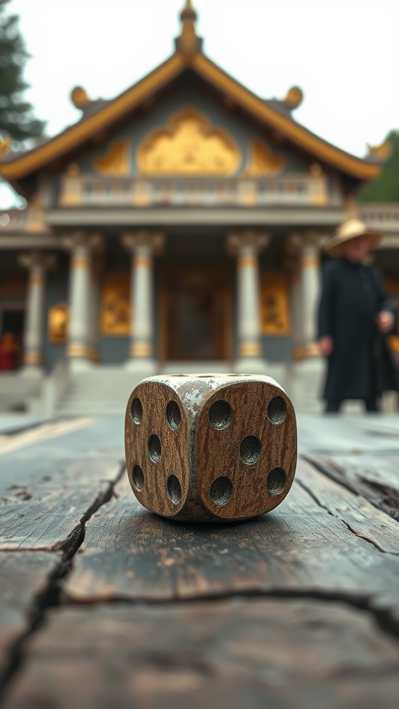 A weathered eight-sided dice rests prominently on a rustic wooden table, its aged facets catching a whisper of light. Behind it, a temple gleams subtly with ivory and gilded tones, casting an aura of timelessness and reverence. The light caresses the scene gently, creating a harmonious play between clarity and softness. The camera's gaze is intimate, focusing tightly on the textured dice, where numbers etched with history beckon with quiet mystery. In the unfocused distance, the blurred forms of an elderly gentleman and a figure reminiscent of Ian McKellen linger, adding a ghostly echo to the composition. The frame is intentionally minimalist, with the interplay of foreground and backdrop stirring a dramatic yet enigmatic narrative beneath the surface.