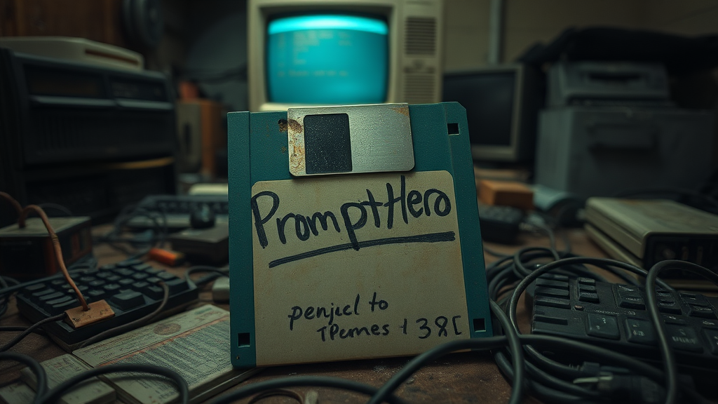A weathered floppy disk with "PromptHero" scrawled in faded marker, surrounded by scattered vintage computer parts, dusty cables, and a dimly lit room. The atmosphere is nostalgic, capturing the essence of early computing days with a warm, muted color palette. In the background, an old CRT monitor flickers faintly, casting a soft glow over the scene, while a slight haze adds to the raw, untouched vibe.
