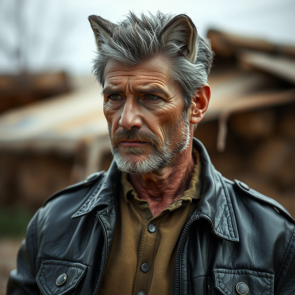 A weathered sir in oilslicked black leather, late 80s, ruggedly handsome, weathered uniform creases, broad chest, piercing unyielding eyes locked on distance behind the lens, gray fox furrowed gently, nobly creased face stoically sculptured, echoed studio light cool mod flair 4k fiocchi grey olive vibes sticky Kodachrome range.