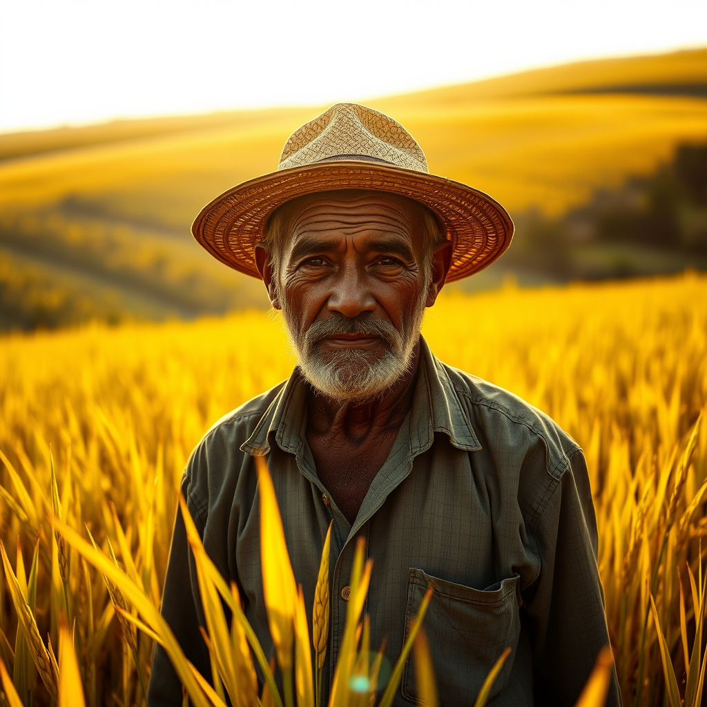 A weathered Spanish farmer stands amidst golden rice fields, his silhouette seamlessly blending with the sunlit landscape, as layers of ripening rice plants overlap his worn features, evoking a sense of unity with the land he tends.