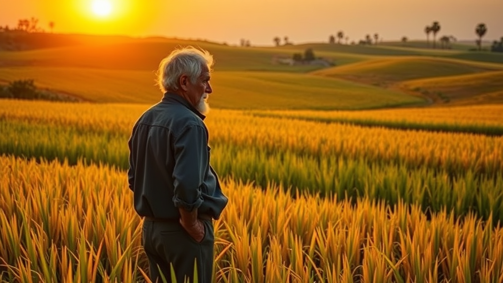 A weathered Spanish farmer surveys his fertile rice fields, his silhouette blending seamlessly with the vibrant layers of waving green stalks and golden grains, as the setting sun casts a warm glow that highlights both the land's abundance and his deep connection to it, creating an impressionistic fusion of tradition and nature.