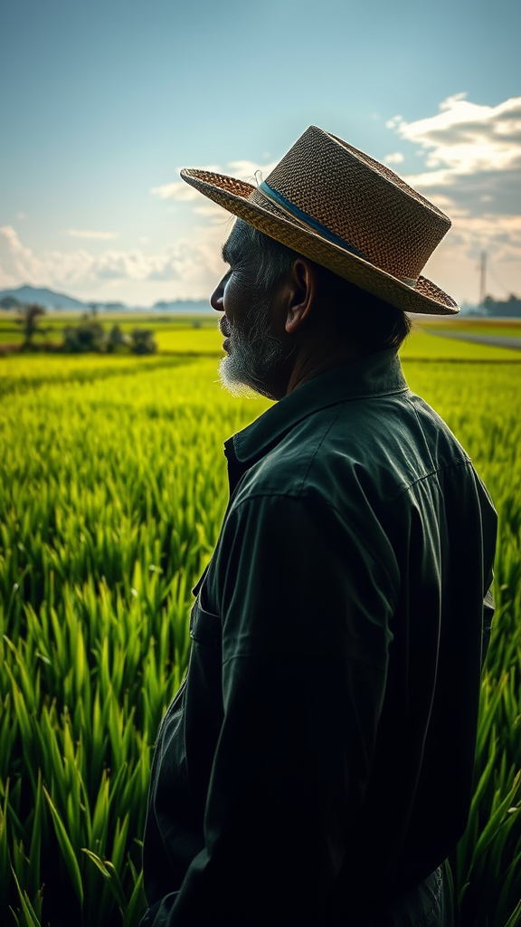 A weathered Spanish rice farmer gazing thoughtfully into the horizon, his silhouette intricately intertwined with lush, verdant rice fields that stretch beyond sight, creating a harmonious double exposure of time-honored agricultural tradition and the vibrant tapestry of the land.