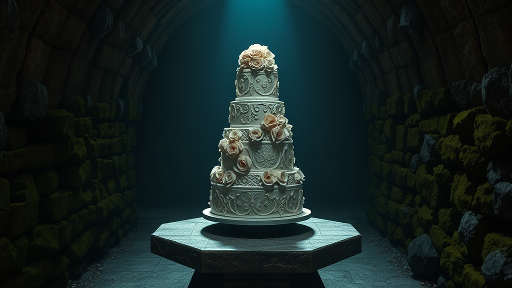 A wedding cake adorned with intricate details sits majestically on a stone table in the dimly lit catacombs, surrounded by an atmosphere of haunting elegance. The hyper maximalist cake, a masterpiece of delicate sugar roses and ornate carvings, stands in stark contrast to the ancient, moss-covered stone walls. Rendered in 8k, the scene captures a mesmerizing interplay of light and shadow, highlighting the cake's opulence amidst the austere surroundings. Inspired by the artistic visions of Greg Rutkowski, Peter Mohrbacher, and Magali Villeneuve, this octane-rendered image blurs the boundaries between fantasy and reality, evoking a sense of surreal wonder.