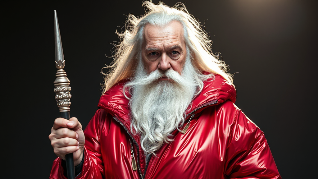 A well-lit fashion shoot portrait of Gandalf, holding a scepter, wearing a metallic crimson inflatable oversized jacket designed by Yeezy and Balenciaga. The focus is sharp and clear, with intricate, cinematic, and glamorous features, exuding a Vogue editorial fashion vibe. The lighting is soft and indirect, highlighting the symmetry of the full-body pose. The scene is void of common portrait errors such as low resolution, anatomical inaccuracies, or blemishes. Gandalf's distinguished features are meticulously captured with precision, illustrating the elegance of high fashion against a backdrop of runway sophistication. The composition ensures grandeur without distortion, showcasing artistry in its finest form.