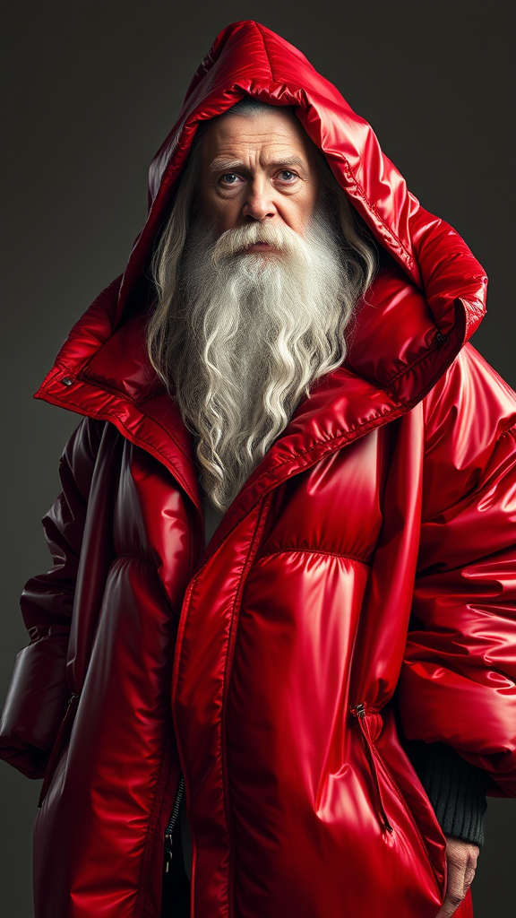 A well-lit fashion shoot portrait of Gandalf wearing a high-fashion metallic red inflatable oversized jacket, blending futuristic elements with classic wizardly style. This piece is designed by the enigmatic brands Yeezy and Balenciaga, showcasing sharp focus, intricate detailing, and cinematic flair. The attire is complemented by soft, indirect lighting, creating a glamourous and symmetrical image suitable for a Vogue editorial. Paintings and sketches capture the full-body shot, emphasizing elegance and fashion artistry. Attention is given to Gandalf's distinctive features, maintaining authenticity and character while infusing a modern, high-fashion aura. The portrait evokes sophistication and timelessness, celebrating the fusion of fantasy and contemporary design.