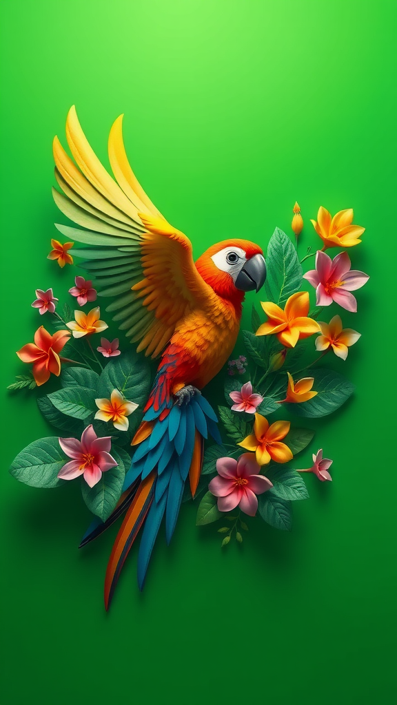 A whimsical 3D abstraction of a parrot takes flight, its vibrant feathers seamlessly merging with lush foliage and exotic flowers, all radiating a soft luminescence against a vivid emerald backdrop.