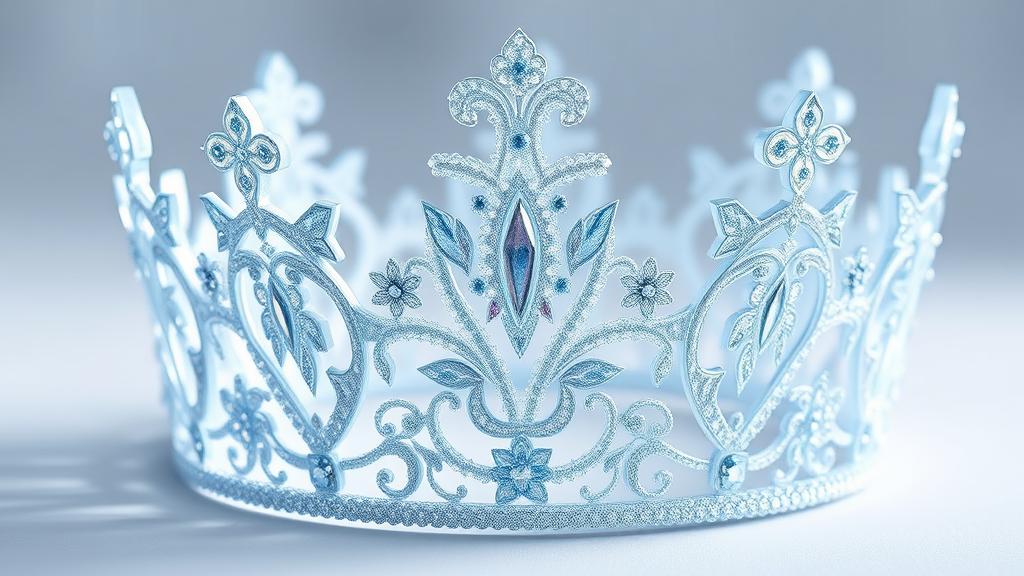 A whimsical 3D princess crown with intricate icy details, inspired by fairytale magic, featuring elegant curves and delicate embellishments reminiscent of Disney's Frozen, with a touch of Philippe Starck's modern design flair. The crown sparkles and glitters in soft, iridescent hues, creating a harmonious blend of enchanting elegance and innovative artistry.