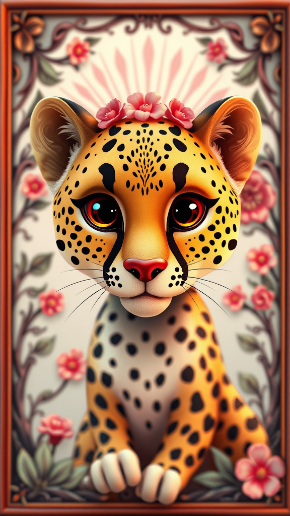 A whimsical 3D render in a cinematic style featuring a cheetah adorned with intricate classical floral elements radiating softly from the center of its face. The scene captures a playful blend of Pixar and Disney influences, with a touch of surrealism through unconventional color choices. The cheetah, surrounded by a beautifully detailed woodcutting template, is portrayed in a cartoonish, fantastical manner with smooth, glazed textures. Despite the vibrancy, elements of abstraction are present, with artistic blurring effects creating a dreamlike quality. In this imaginative setting, the cheetah's features and limbs exhibit exaggerated, fantastical proportions, reminiscent of video game character designs. The piece occupies a striking 8K canvas, enclosed within an elegant frame, celebrating the beauty in the merging of realistic and imaginative styles.