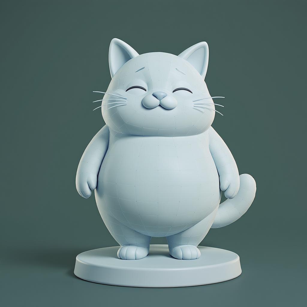 A whimsical 3D-rendered sculpture of a plump, cartoonish feline posed upright on a circular pedestal. The figure boasts a smooth, clay-like finish and a visible quad polygon topology, imparting a distinctive wireframe overlay aesthetic. This cat exudes calm with its serene, closed-eye smile, accompanied by petite, rounded ears and a bushy tail. The sculpture is crafted in a soft pastel blue material, set against a muted dark green backdrop, ideal for digital modeling displays or character design presentations.