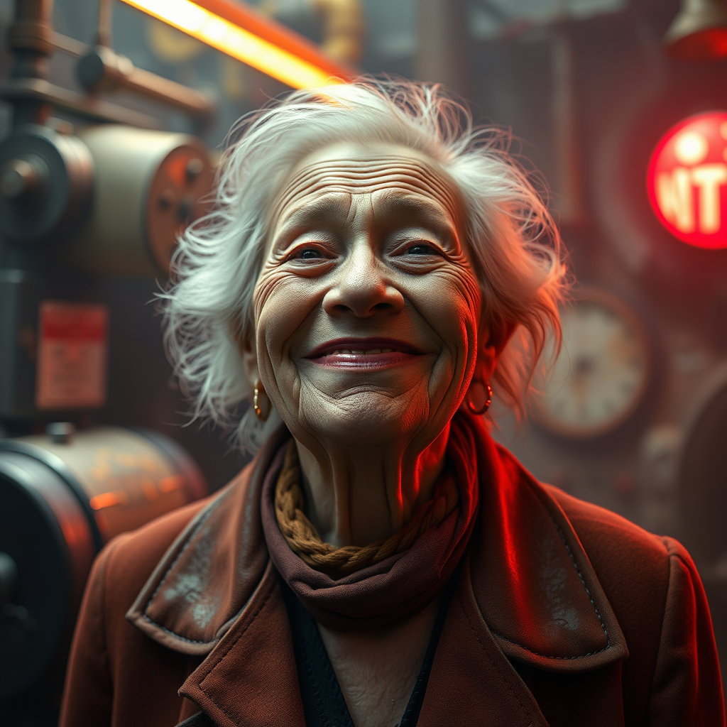 A whimsical 70-year-old woman with a playful, cheeky smile captures the viewer's attention. Her skin, slightly blubbery with age, reflects character and experience. This cinematic shot is inspired by the artistic styles of Mark Citret, Guillermo Espinosa, and Carl Frederik von Breda, among others. Set in a steampunk environment, the scene is enhanced by a sophisticated interplay of negative space and vibrant color gradients. The photo, reminiscent of an analog style, is both hyper-realistic and ultra-high-definition, made possible by the superior quality of a Fujifilm XT3 and an Olympus XA2 camera, utilizing an 85mm lens at f/2.8. The shot is beautifully lit with soft, high-quality lighting and film grain, emulating a vintage cinematic style. The image uses volumetric lighting and fog to add depth, while reflections and moist textures contribute to its realism. With a shallow depth of field, the scene attains an editorial, fashion-shoot quality. A nod to Modular Constructivism and the Thomson MO5 color palette infuses a sense of psychedelic surrealism into this delightful portrait.