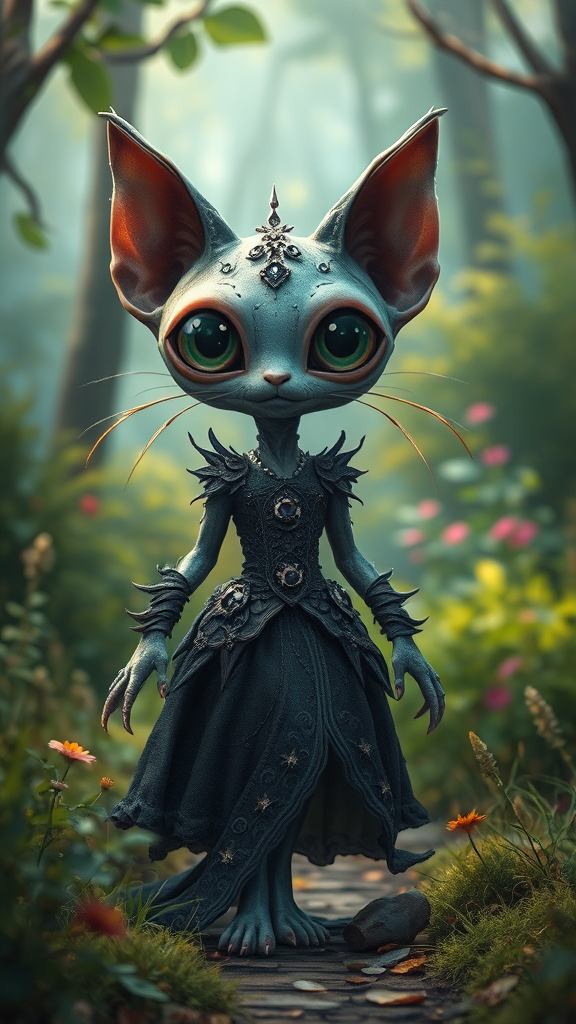 A whimsical alien feline creature with enormous eyes resembling a peculiar blend of squid and kitten dons an intricate dark gown adorned with thorny embellishments, striding gracefully through a verdant woodland. The scene is bathed in iridescent hues, reminiscent of a lush animated dreamscape with cinematic lighting. The landscape is crafted with painterly precision, using depth of field to add a sense of immersion, and every minute detail telling a story, capturing the essence of a trending masterpiece in digital art circles.