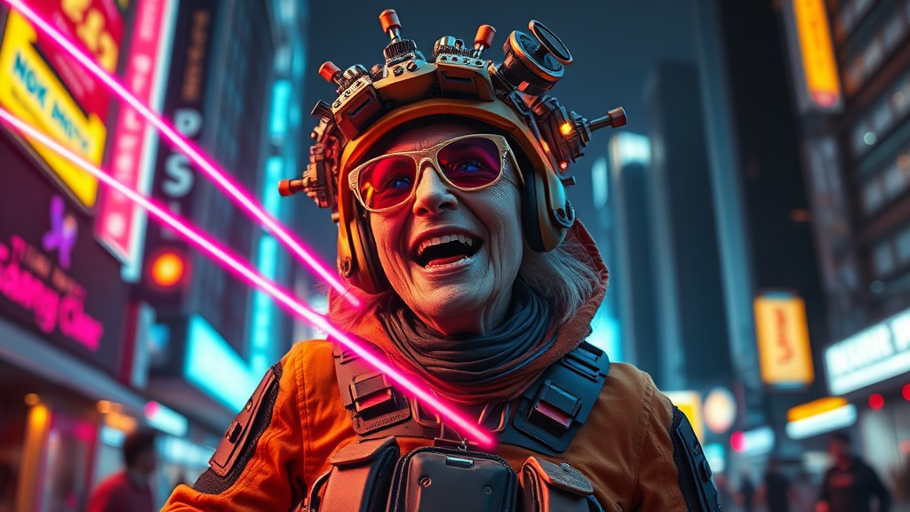 A whimsical and eccentric elderly woman with a futuristic combat outfit, her laughter echoing wildly as she strikes a dynamic pose, emitting dazzling laser beams. Her full body shot is captured in ultra-wide angle, showcasing her elaborate biomechanical headdress alongside her quirky, futuristic sunglasses. Surrounded by a vibrant tapestry of tattered blacklight city lights, she stands against a night cityscape backdrop, rendered in hyper-realistic detail with super fine intricacies, in glorious 8k resolution. Her presence exudes a delightful blend of kookiness and cybernetic charm, her outfit weaving together elements of high-tech and whimsical disorder as if she's emerged from a cybernetic fantasy.