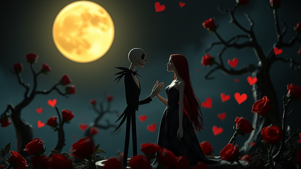 A whimsical and eerie scene unfolds under the luminous glow of a heart-shaped moon in a dark night sky, where Jack Skellington and Sally, embodying their timeless love, share a tender moment amidst a Valentine love fest. Surrounded by a surreal landscape of twisted, skeletal trees adorned with crimson roses and floating hearts, their affection is captured in the classic Tim Burton style. The stop motion animation enhances their delicate movements as shadows play across their enchanting world. Cinematic composition and depth of field create a mesmerizing atmosphere, drawing viewers into this hauntingly romantic tableau.