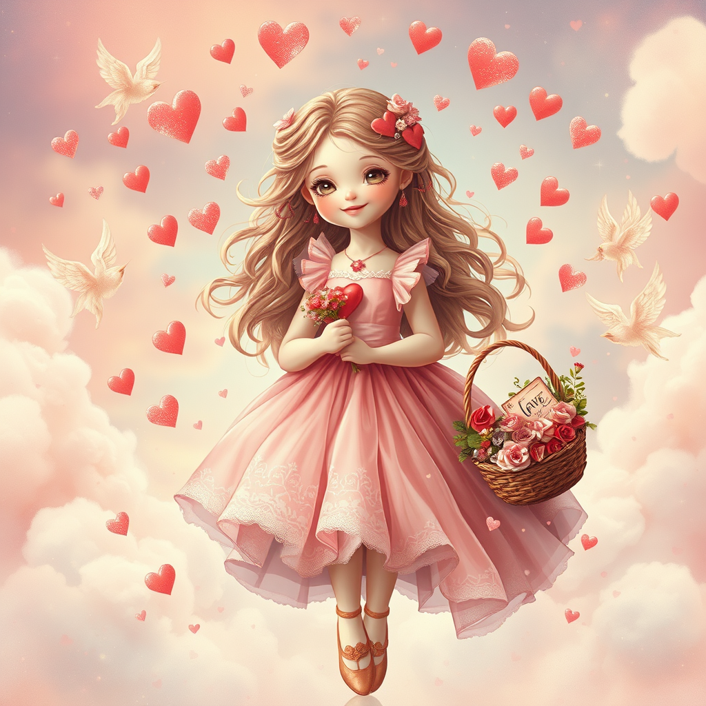 A whimsical and enchanting depiction of Valentine's Day personified as a delightful girl, adorned in a flowing dress of soft pink and red hues, reminiscent of rose petals. Her hair cascades like spun sugar, intertwined with delicate heart-shaped accessories. She holds a basket overflowing with fragrant flowers and love notes, a playful smile gracing her face. Around her, a flock of cupid-like cherubs flutters, scattering glittering heart-shaped confetti in the air. The backdrop is a dreamy, pastel-hued sky with floating clouds that resemble cotton candy, encapsulating a scene filled with warmth, joy, and the essence of love.