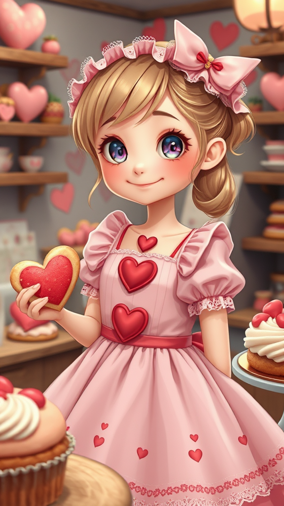 A whimsical and enchanting portrayal of Valentine's Day personified as an adorable girl, captured in an ultra-realistic digital artwork with influences from Unreal Engine, resembling the vibrant and detailed style of Artgerm. She radiates a Studio Ghibli charm with delicate features and a playful demeanor, her smile as warm as freshly-baked cookies. Her dress is a cascade of soft pinks and reds, adorned with heart motifs and delicate lace. Her eyes are large and expressive, sparkling with joy and mischief. The scene is set in a cozy, inviting bakery where she conjures sweet confections, each a masterpiece of affection and artistry. The composition is impeccably detailed, with rich textures and colors that evoke a sense of wonder, crafted in sharp focus reminiscent of Alexei Vinogradov's distinctive style, suitable for showcasing on platforms like DeviantArt and ArtStation.