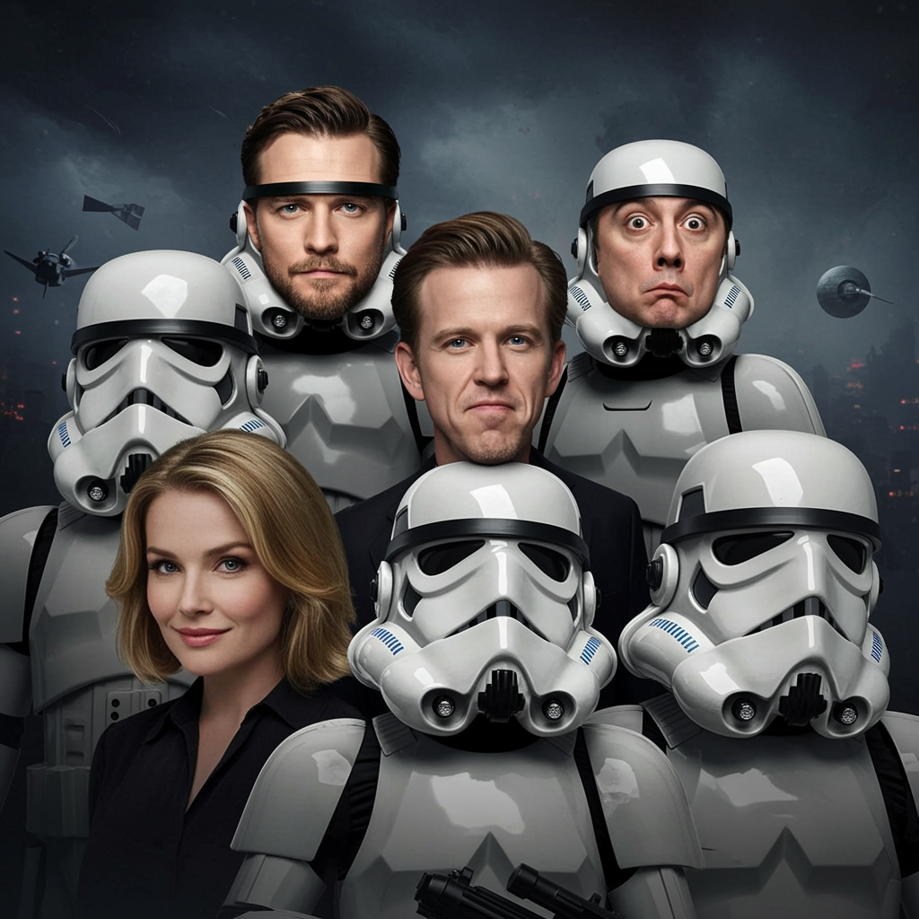 A whimsical and imaginative digital art piece depicting Hollywood celebrities reimagined as stormtroopers from the Star Wars universe, their well-known facial features and expressions humorously peeking through the iconic armor. The composition features a range of famous actors and actresses, each portrayed with subtle caricatured elements to enhance their recognizability. Set against a moody, atmospheric backdrop, this artwork blends humor and satire with a nod to geek culture, capturing the playful spirit of a galaxy far, far away.