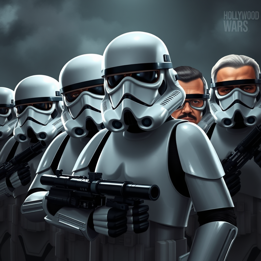 A whimsical and imaginative digital art scene portraying Hollywood A-listers as stormtroopers, donning the classic Star Wars armor. Each celebrity is easily recognizable through distinct facial features and playful expressions, adding a humorous touch. Set against a moody and dramatic backdrop, blending elements of satire and geek culture, the composition captures a balance of comedy and fandom. Subtle creative twists infuse additional layers of personality and charm into this cinematic crossover.