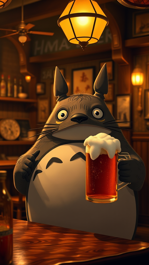 A whimsical and slightly tipsy Totoro holding a frothy beer mug at a cozy, dimly lit bar, surrounded by a warm and inviting atmosphere, capturing the enchanting essence of Studio Ghibli with cinematic lighting and photorealistic details, evoking a sense of playful mischief and magical realism.