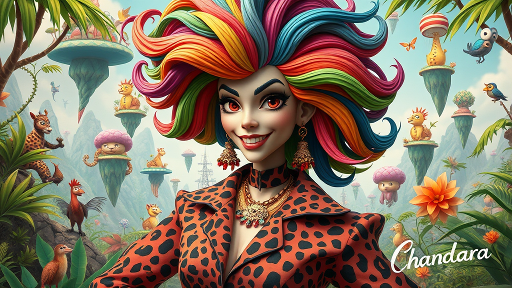 A whimsical and surreal 3D render depicting a Dr. Seuss-inspired Safari Queen, adorned with an eclectic mix of animal prints and wild patterns, exuding confidence with a playful yet fierce expression. Her vibrant hair is a kaleidoscope of swirling colors. The background showcases an enchanting jungle filled with talking animals, oversized plants, and floating islands in a mesmerizing scene. This masterpiece combines anime, fashion, and dark fantasy elements, emphasizing dynamic composition and vibrant colors. The artist's signature, "Chandara," is elegantly placed on the right, adding a personal touch to this captivating illustration.