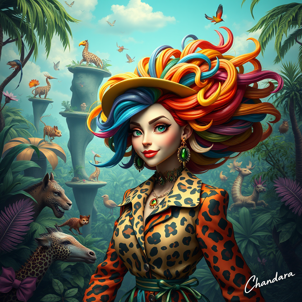 A whimsical and surreal scene features a Dr. Seuss-inspired Safari Queen, adorned in an eclectic mix of animal prints and wild patterns. Her vibrant, swirling hair cascades in a kaleidoscope of colors, exuding confidence with a playful yet fierce expression. In the enchanting jungle backdrop, life abounds with talking animals, oversized plants, and floating islands, creating a mesmerizing tableau. This 3D render blends elements of anime, fashion, and dark fantasy, emphasizing dynamic composition, vibrant colors, and conceptual art. Delicately placed on the right, the artist's signature, "Chandara," adds a personal touch to this captivating masterpiece.