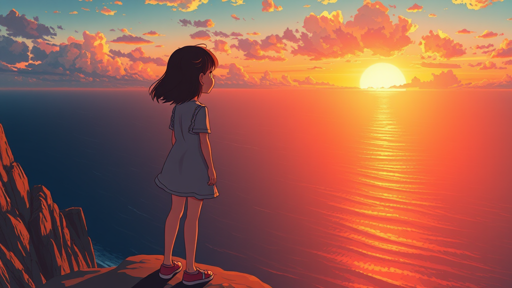 A whimsical anime visual features a charming young girl gazing out at a breathtaking sunset over the vast ocean, her silhouette framed against the fiery hues of the sky. She stands gracefully at the edge of a rugged cliff, the sea breeze playfully tousling her hair. The golden light dances on the water below, creating an ethereal atmosphere as the sun dips closer to the horizon, casting long shadows and a sense of serene wonder.